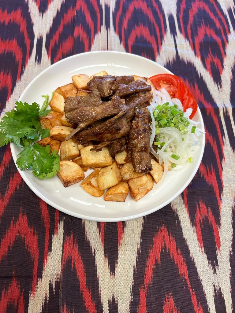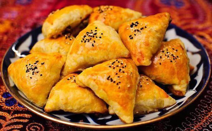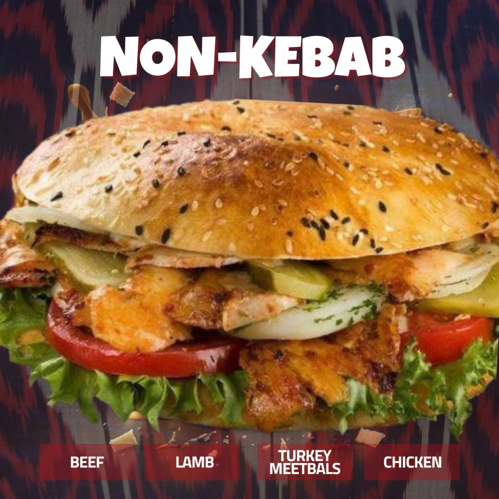 Non Kebab is a famous Uzbek burger made with sautéed lamb, chicken, or beef, stuffed with pickles, greens, onions, and tomatoes. It is served with a side of French fries and special sauces.